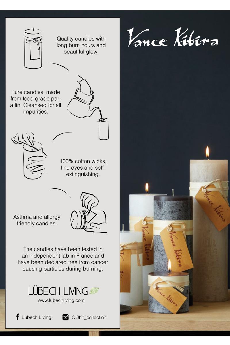 Takket være den helt rene voksen, som er renset for alle urenheter og oljerester får vi eksepsjonelt lange brennetider i forhold til lys av dårligere kvalitet, hvor rester av olje får lysene til at brenne hurtigere ned. Vi kan kun anbefale å bruke Vance Kitira lys, de er langt mere end et alminnelig lys.