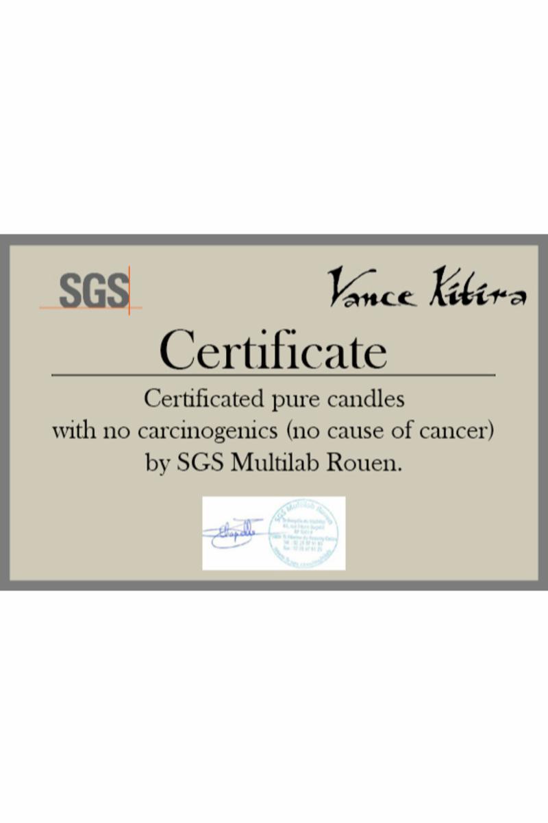 Vance Kitira's Timber® Candles er testet og sertifisert på SGS Laboratory i Frankrike. Testen konkluderer, at lysene er uten noen kreftfremkallende partikler ved anvendelse. Lysene anvendes av astmatikere og allergikere uten problemer.